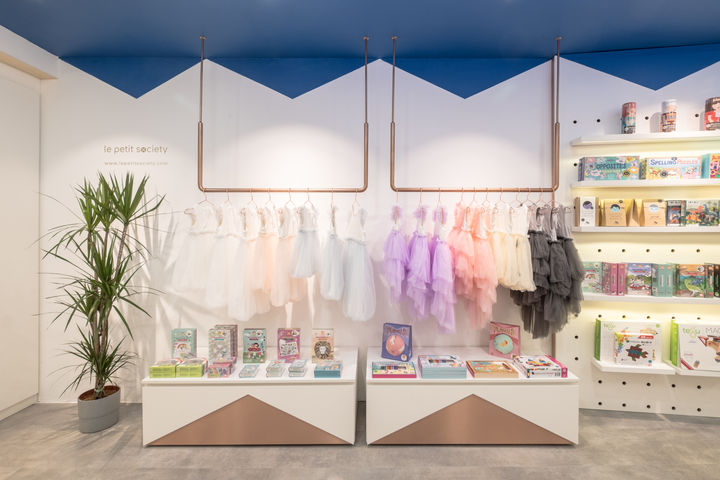 Copper elements that had been used more sparingly in their first shop have also been played up. Suspended clothing racks of varying heights and finished in satin copper add an elegance to the shop that belies its focus not just on children’s clothing, but also on apparel for young parents.